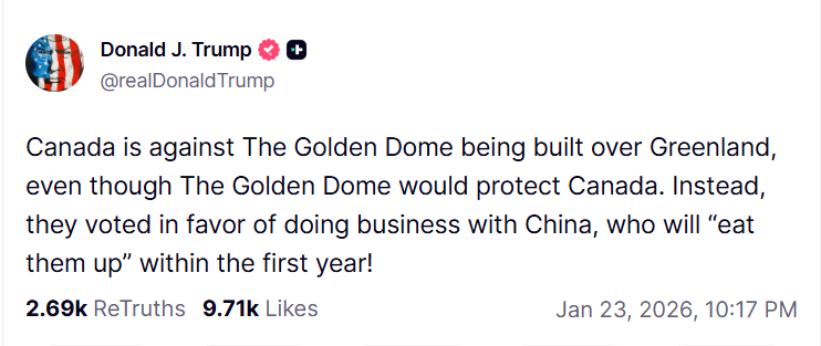 "Канада виступає проти будівництва "Золотого купола" над Гренландією, хоча "Золотий купол" захистив би Канаду", - написав Трамп.
